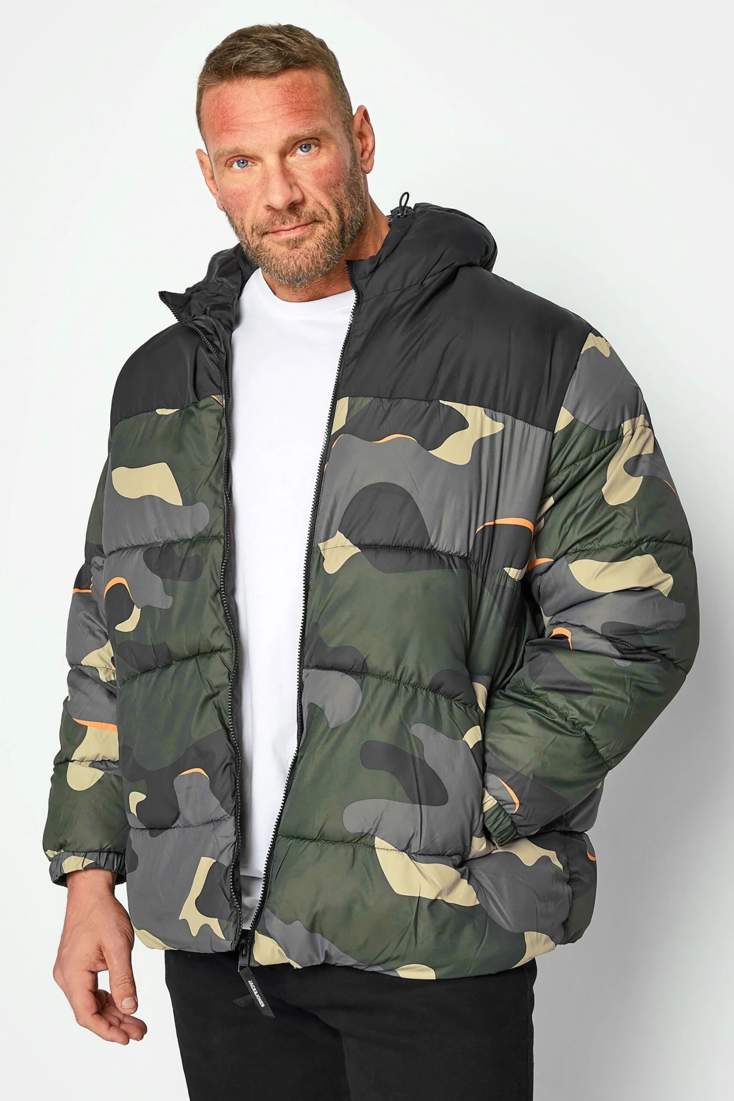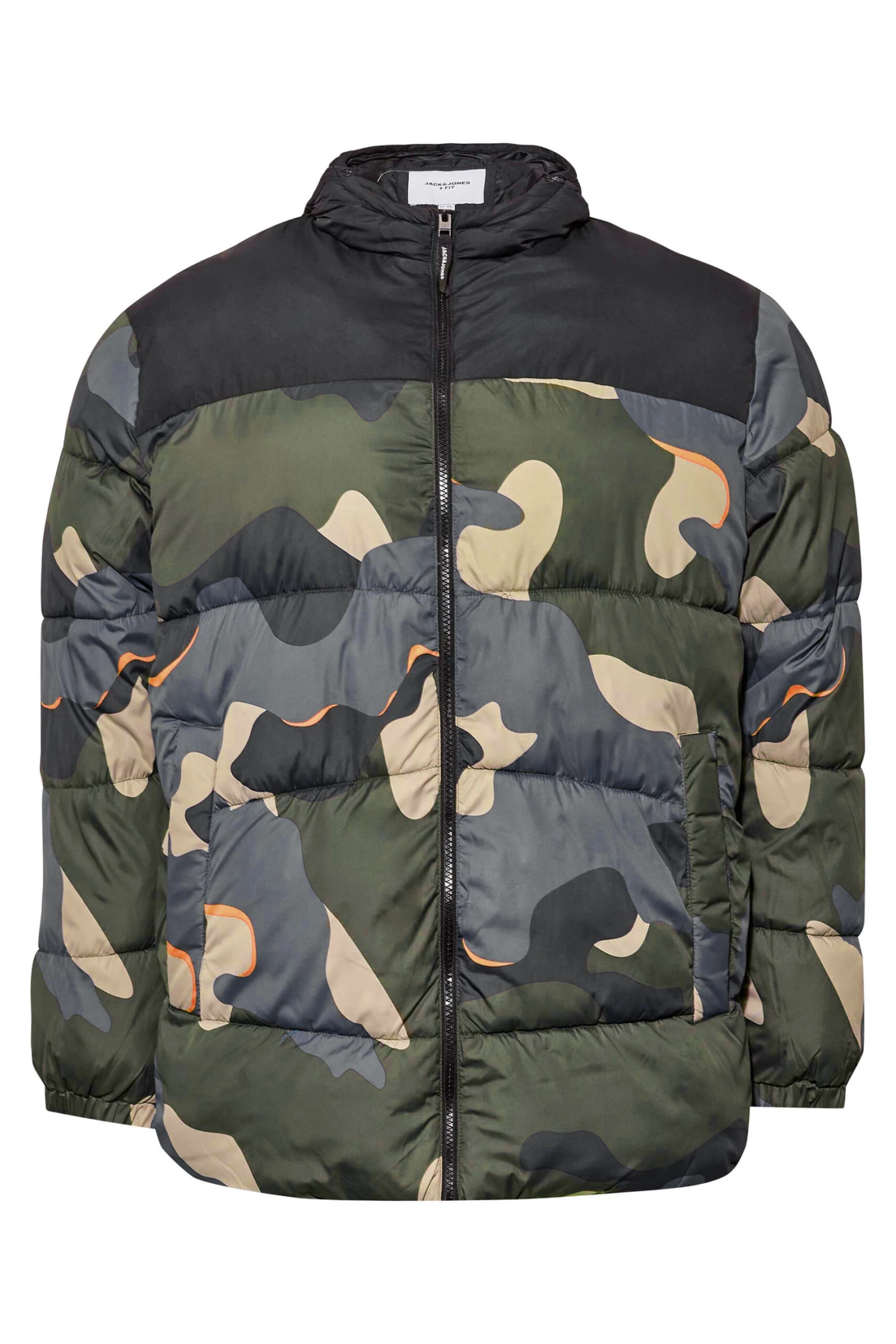 JACK & JONES Big & Tall Black Camo Hooded Puffer Coat