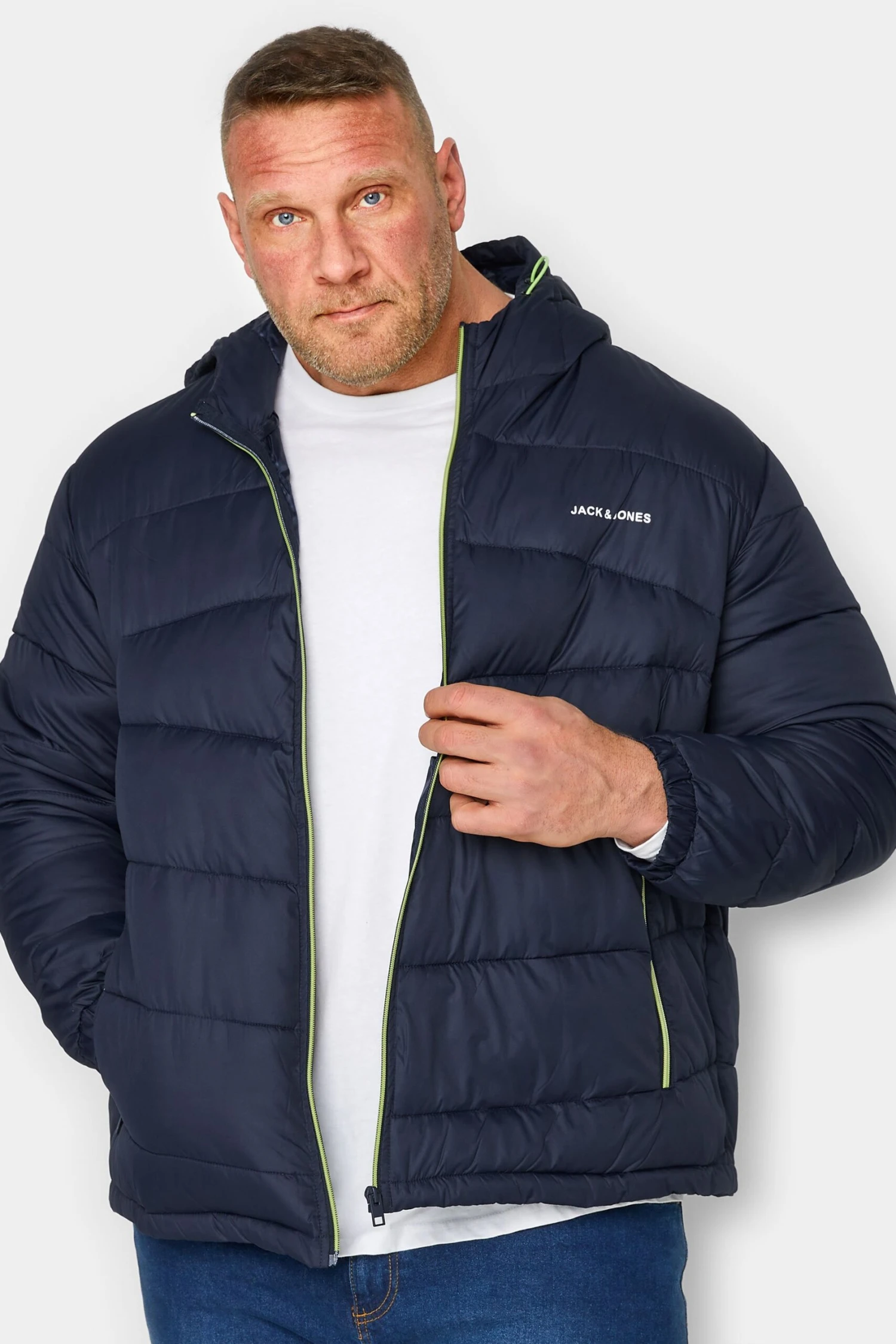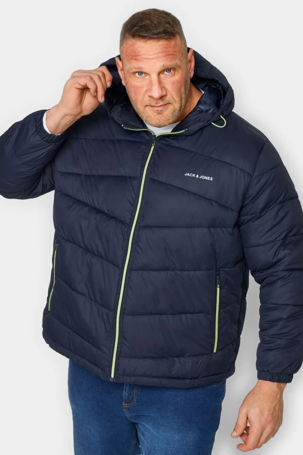 JACK & JONES Big & Tall Navy Blue & Yellow ’90’ Logo Print Hood Coat