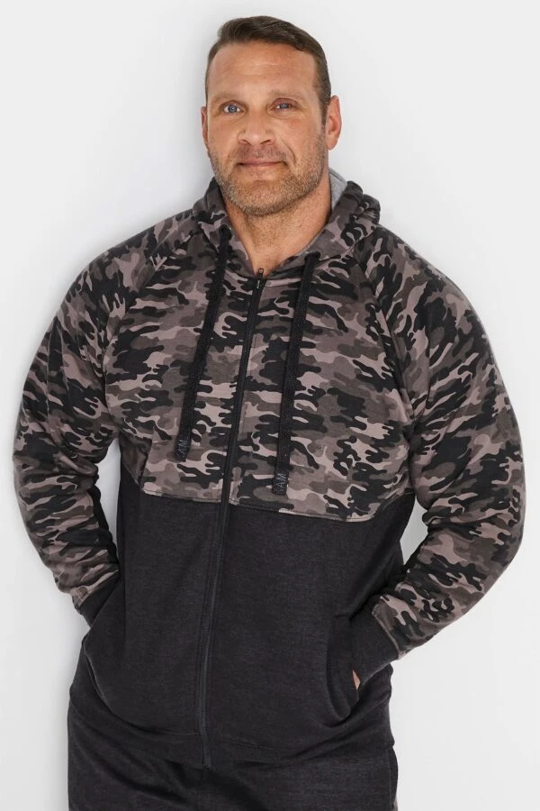 KAM Big & Tall Charcoal Grey Camo Colour Block Zip Through Hoodie